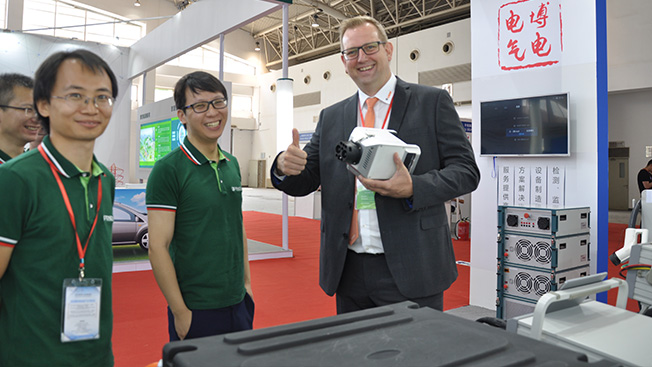 ▲來自德國的技術專家為博電手持式電動汽車充電檢測儀點贊