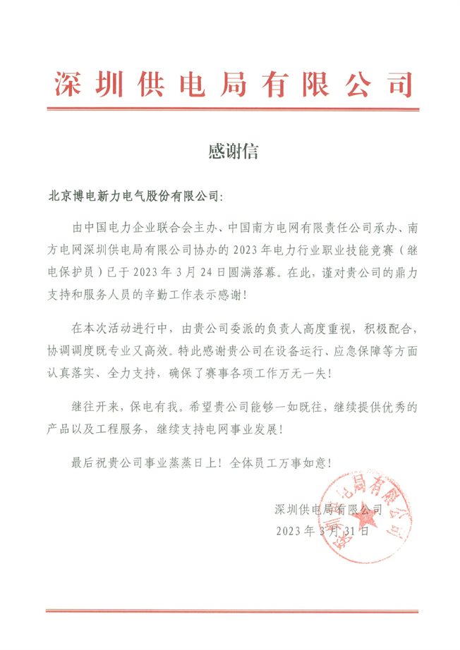近日,博電科技收到來自深圳供電局有限公司的感謝信,對方給予博電科技技術實力和綜合服務充分肯定和高度評價!