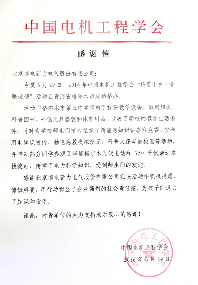 本次活動是繼去年博電參加 “2015電力科普畢節(jié)行”活動之后,又一次為邊區(qū)兒童送去溫暖,為邊遠地區(qū)孩子們更好地學習和成長提供力所能及的幫助。北京博電公司參與科普下鄉(xiāng)活動,關愛邊區(qū)孩子的行為贏得了業(yè)內高度贊賞?;顒咏Y束后,中國電機工程學會給博電公司發(fā)來感謝信,稱贊其高度的社會責任感,勇于擔當,甘于奉獻的社會精神,并對參與本次活動表示感謝。